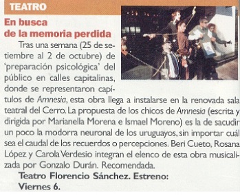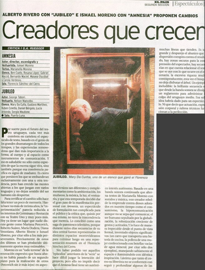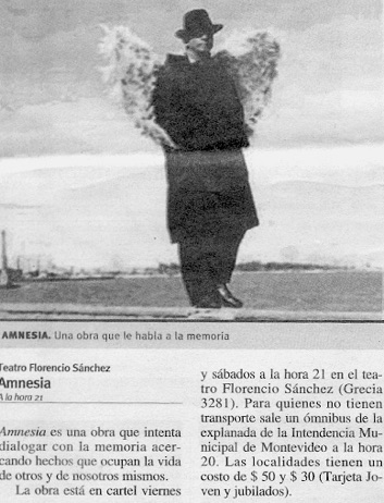 “Amnesia” es un de los proyectos más autobiográficos de Ismael Moreno. El espectáculo lo resume como la mirada de un niño mirando a través de una ventana empañada la calle vacía y desde esos ojos se produce el recuerdo. Una sucesión de imágenes en donde se mezclan los sueños y la pesadilla que se desarrolló en Uruguay durante 13 años, los que duró la dictadura militar.
