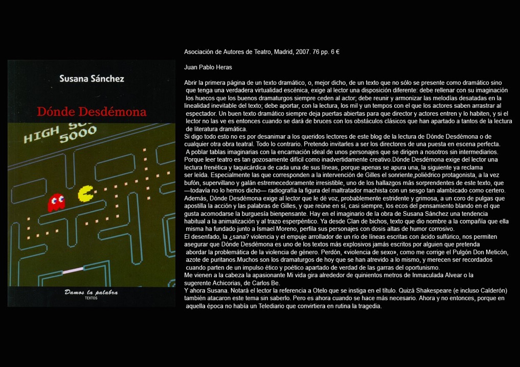 DÓNDE DESDÉMONA, Drama y teatro de objetos De Cía. CLAN DE BICHOS, con dirección de Ismael Moreno. Estreno Sala Cuarta Pared 8 de enero de 2009. Texto dramático subvencionado por la Com. de Madrid 2006 Publicada: Damos la Palabra por la AAT (2007).