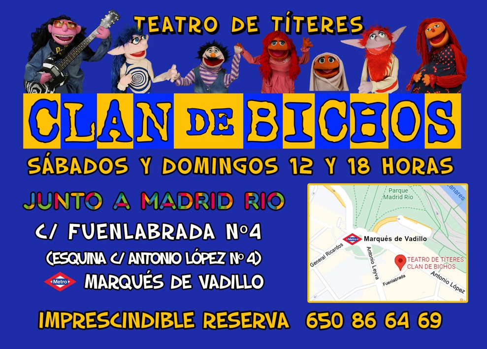 Artes escénicas, audiovisuales, títeres, teatro de objetos, teatro negro, textos y música original en directo son el sello inconfundible de la productora CLAN DE BICHOS.